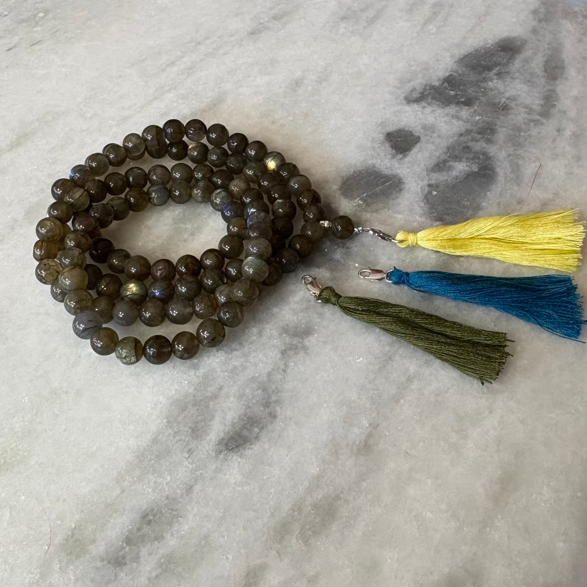 The Labradorite Energy Mala is a sacred companion for meditation, reflection, and inner awakening. Known for its mystical energy, Labradorite is believed to strengthen intuition, protect the aura, and support spiritual transformation