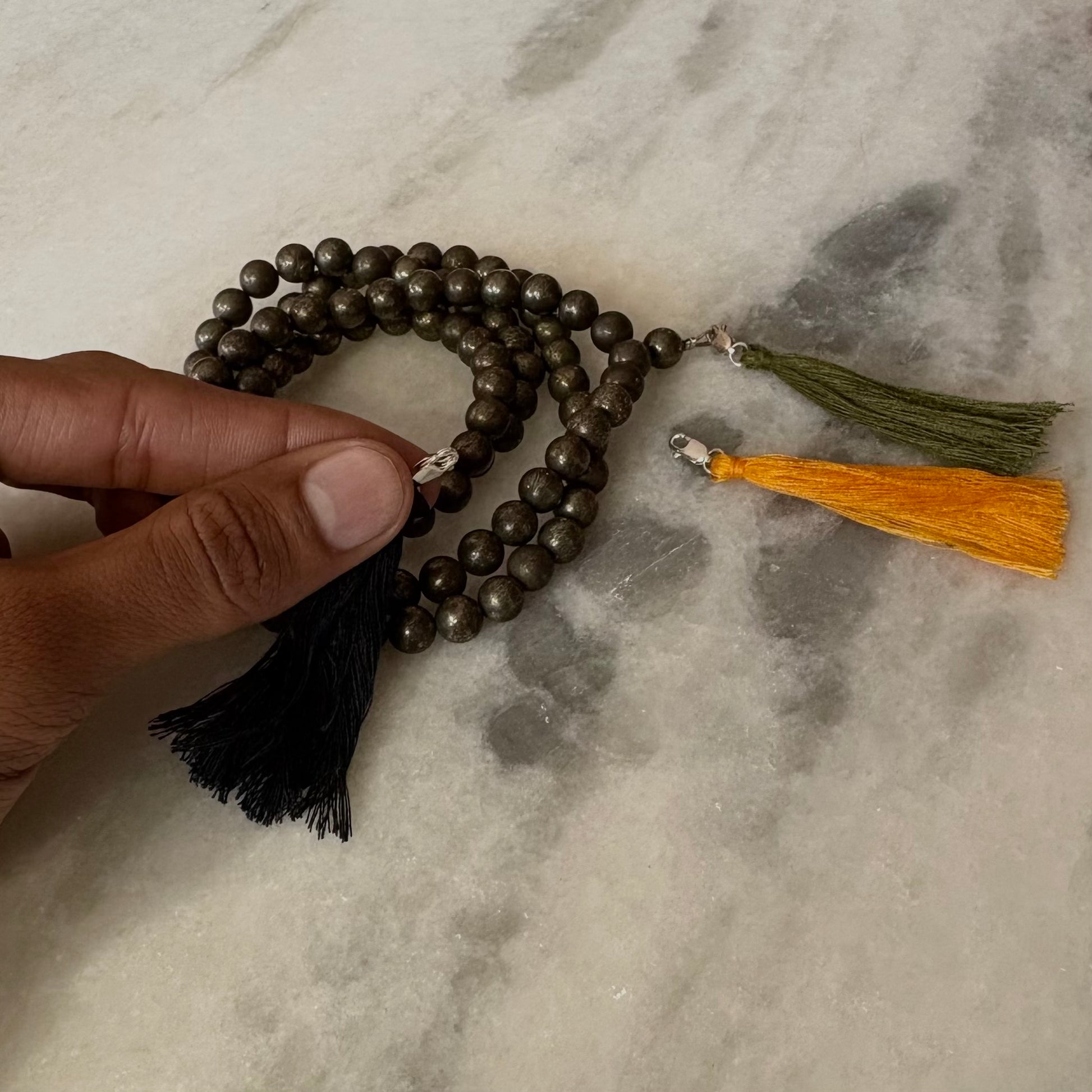The Pyrite Sadhana Mala is a sacred tool crafted for meditation, japa, and mindful practice. Made with natural Pyrite beads, this mala is traditionally associated with protection, strength, and grounding energy.
